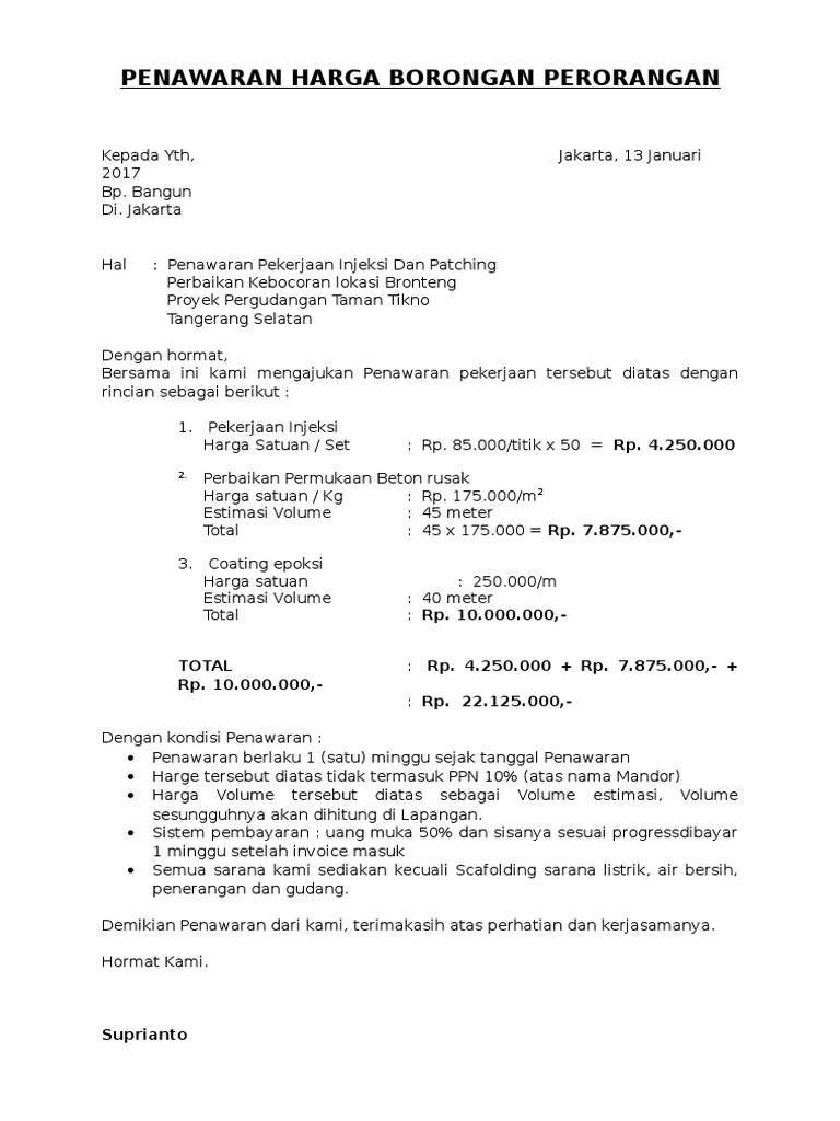 Contoh Surat Penawaran Harga Proyek / 5 Contoh Surat Penawaran Proyek Swasta Konstruksi Dan Lainnya - Tujuan dibuatnya ialah untuk menjual sebuah produk dengan harga tertentu kepada pihak lain.. Untuk memperlancar pembangunan suatu proyek, maka dibutuhkan berbagai kerja sama dengan pihak lain. Penjelasan lengkap seputar contoh surat penawaran yang baik dan benar. Untuk daftar harga telah kami lampirtkan di lembar daftar dan harga menu pada lembar kedua surat ini. Contoh surat penawaran barang dan jasa dan tips pembuatannya. Kami berharap agar penawaran ini dapat.